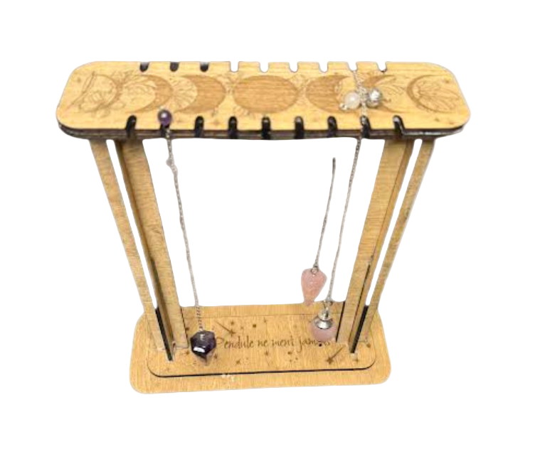 Un présentoir élégant, façonné dans le bois et orné de gravures lunaires. Chaque encoche accueille un pendule, comme autant d’étoiles suspendues dans le ciel nocturne. Entre utilité et beauté, il sublime vos outils divinatoires, tout en les gardant à portée de main. Gravé de symboles protecteurs, il se fait gardien de vos énergies et allié de vos pratiques.