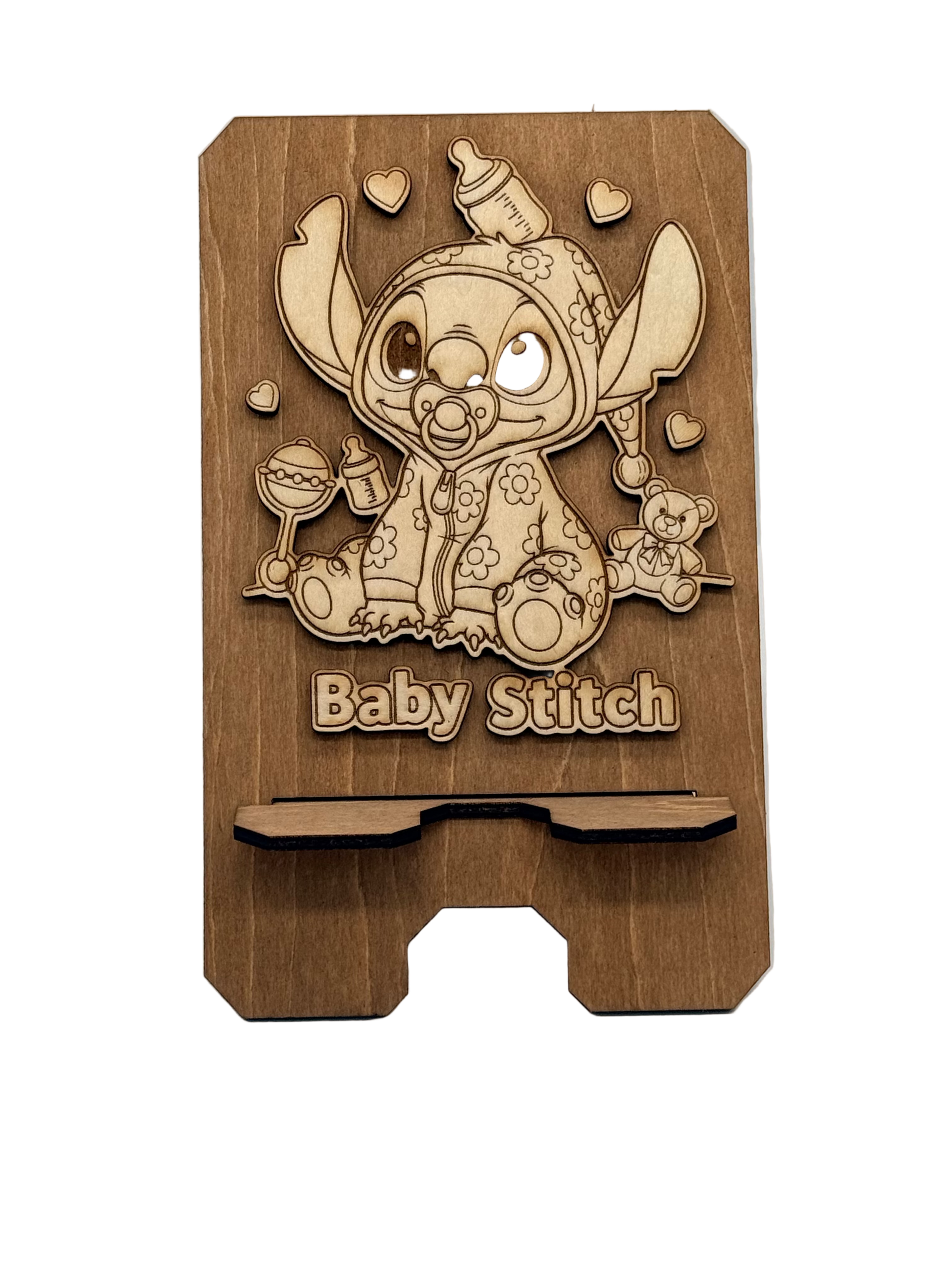 Craquez pour ce support de téléphone Baby Stitch en bois, une création artisanale adorable et fonctionnelle qui apportera une touche de fantaisie à votre bureau ou table de chevet